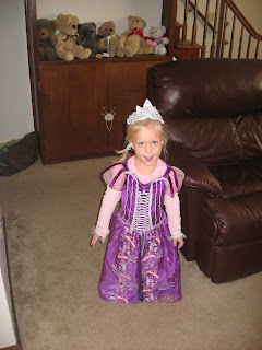 Rebekah continues her fascination with Disney princesses. For a while Rapunzel was all she could think about. She likes to act out various scenes, particularly when we are playing the soundtrack we got from the library. I'm not sure how she does this, but when she is listening to the background instrumental peices in the soundtrack, she actually knows what section of the movie they are from. One time while we were listening to the soundtrack, she found me in the kitchen and covered my mouth with the sash from a white bathrobe and tried to tie it around my head. Of course, this is the part where Flynn Ryder climbs up the tree and sees Rapunzel gagged. She also likes to act out the part where Rapunzel realizes she's the lost princess (first she lies down on the floor, looks up in amazement at the ceiling, stands up and staggers around, then hits the dresser. All right on cue with the music).